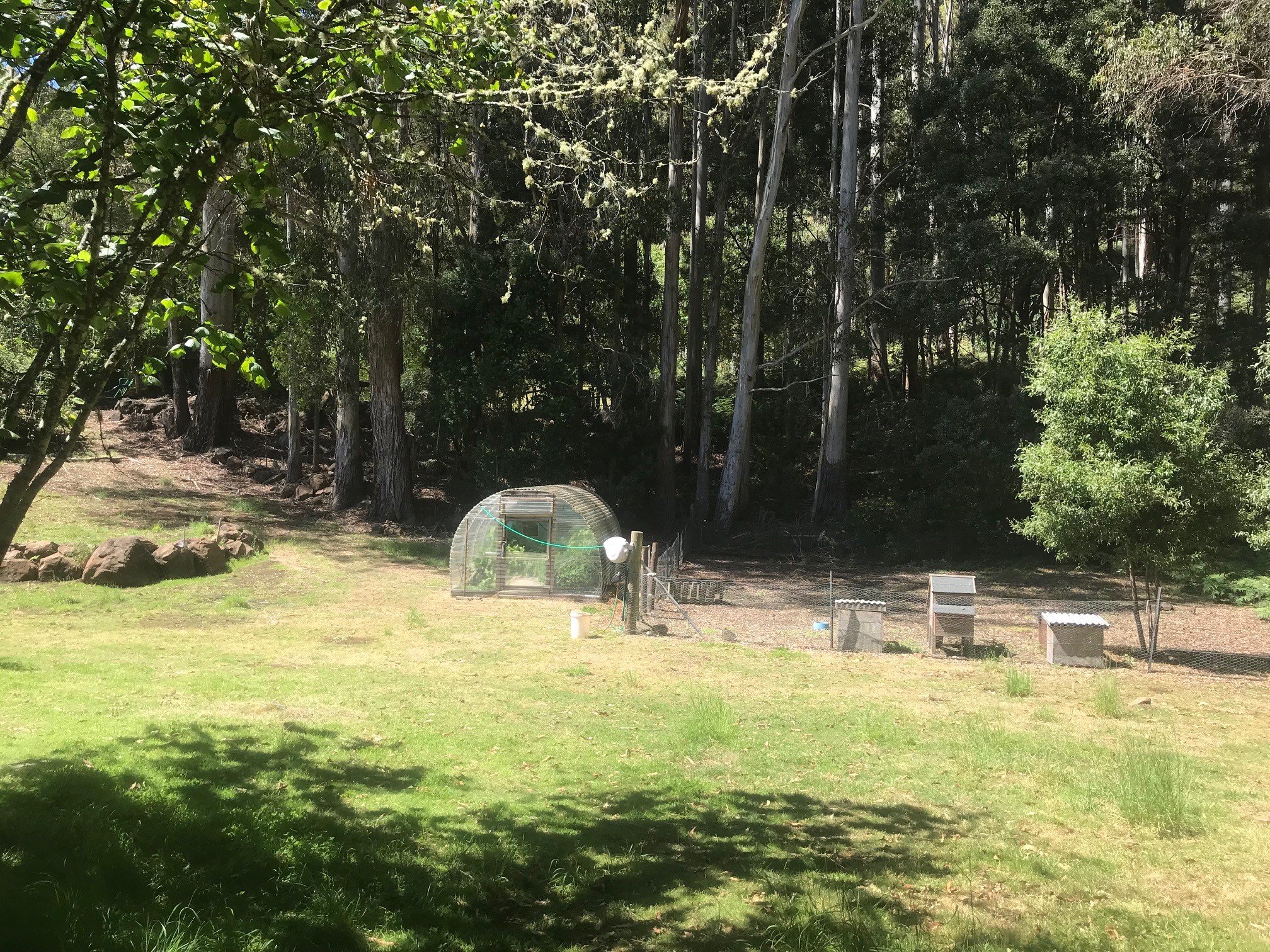 A green-house, large chook-pen and three raised garden beds are in a sheltered area.