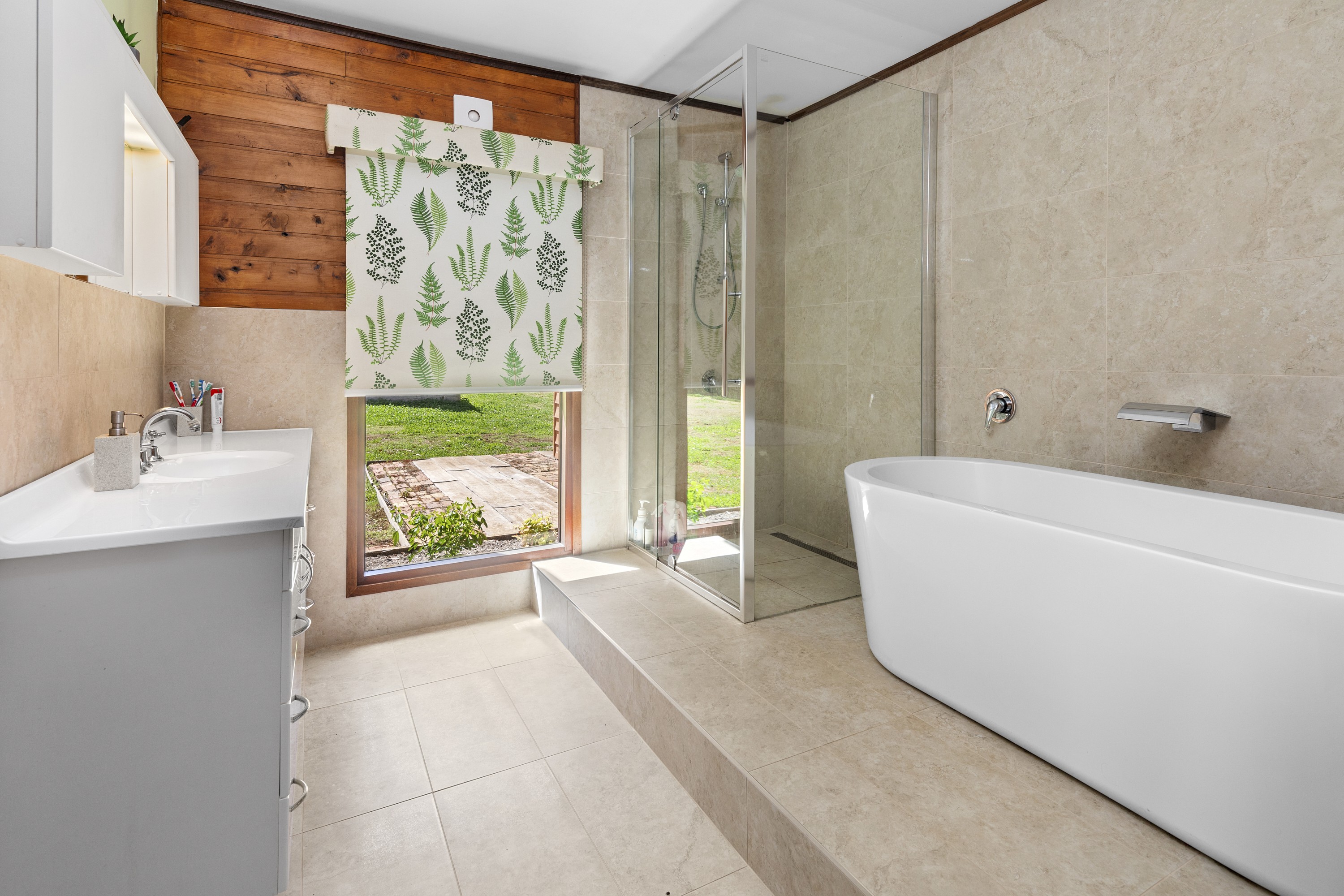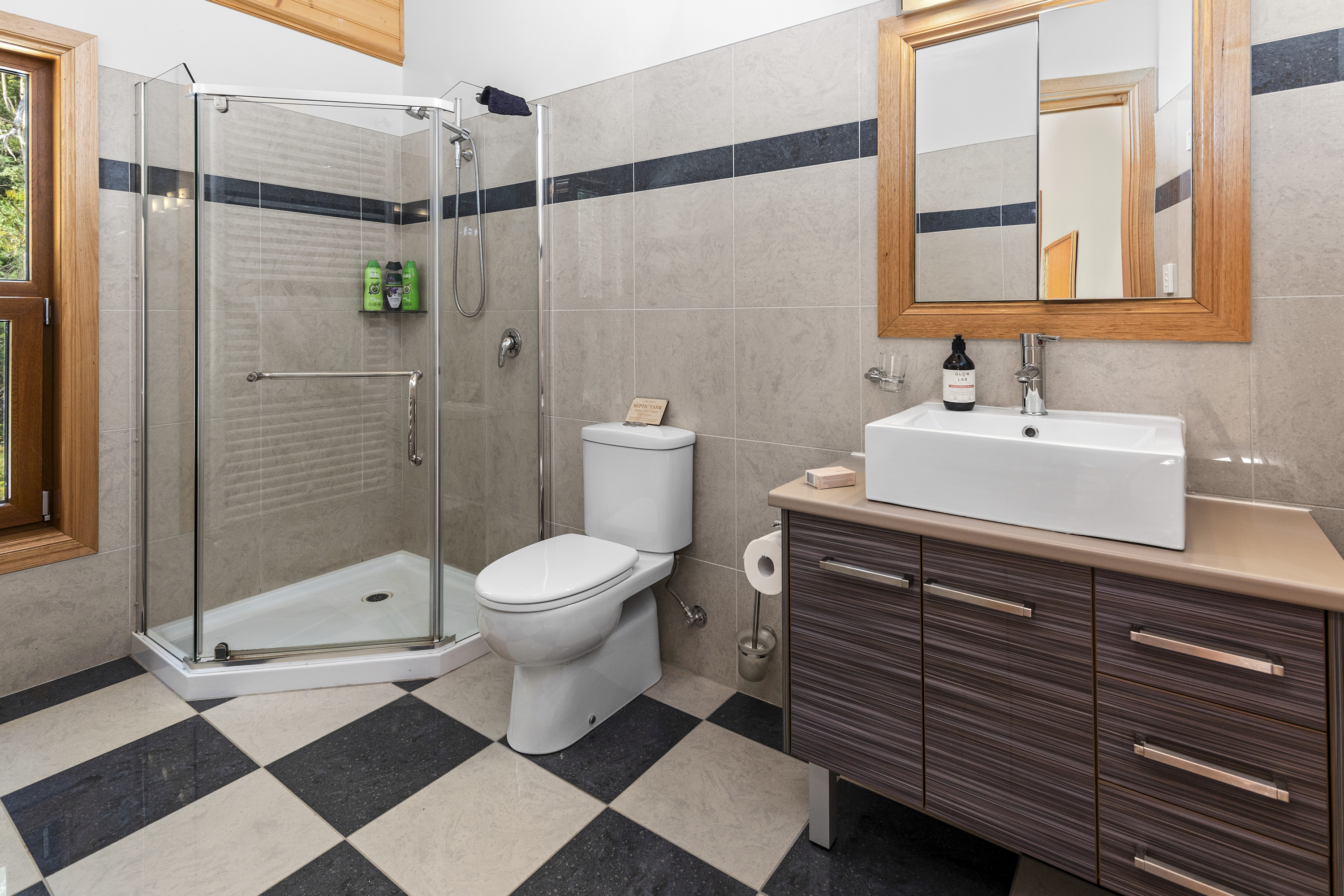 The downstairs unit was originally designed and built to Disabled Use Specifications. To revert to these specifications the following actions would be required to the bathroom: a/ Remove shower screen & replace with shower curtain b/ Remove toilet and replace with disable spec toilet c/ Refit toilet backrest (In storage in 3 door shed) d/ Refit hand rails in shower & toilet areas (in storage in 3 door shed) e/ Refit seat in shower (In storage in 3 door shed)